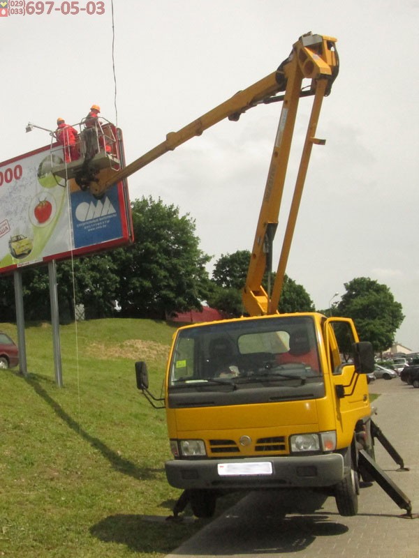 Хотите сэкономить деньги - звоните и заказывайте автовышки у нас по телефонам 8 (029) 697-05-03 и 8 (033) 697-05-03 в любое время. Для Вас мы работаем ежедневно круглый год. На фото: одна из наших автовышек Nissan в г. Гродно на монтаже рекламы.